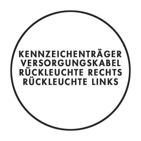 Enthält einen Kennzeichenträger, ein Versorgungskabel und beide Rückleuchten.